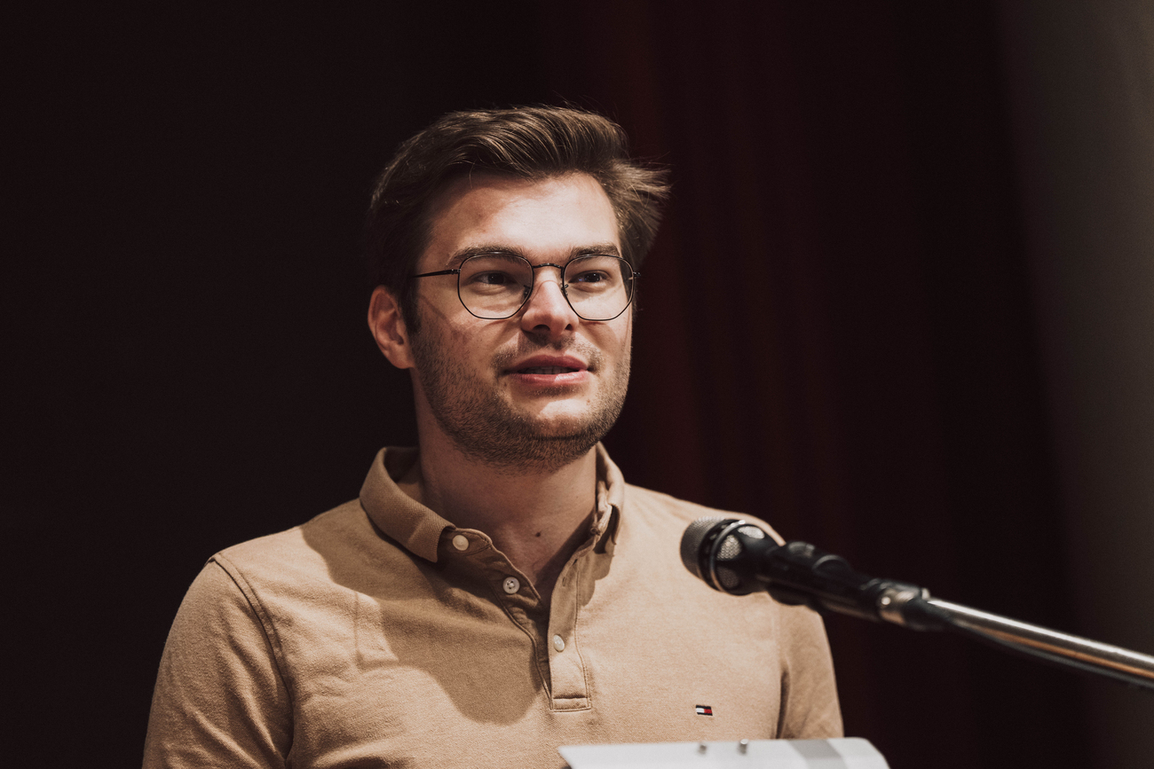 Bildunterschrift: Leon Kolb stellt sich in Stutensee den Delegierten der Jungen Union Baden-Württemberg vor.